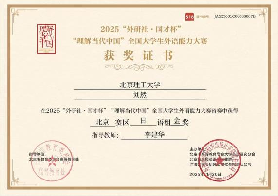 近日,2025“外研社·国才杯”“理解当代中国”全国大学生外语能力大赛(日语组)圆满落幕。经过校赛、省赛、国赛层层高强度比拼,我校日语系选手在李建华、吉田阳介老师的指导下,捷报频传,展现了过硬的专业实力与良好的综合素养!其中,刘然同学在北京市赛中斩获金奖,并凭借出色表现晋级国赛,最终摘得国赛铜奖;赵思瑞同学荣获北京市赛银奖;甘雨、曾翊航两位同学也在北京市赛中取得铜奖的优异成绩。