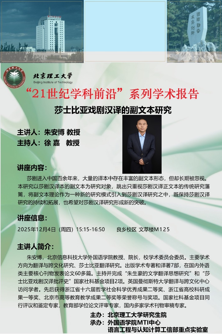 2025年12月4日下午,应必威西汉姆联MTI中心及语言工程与认知计算工信部重点实验室邀请,北京信息科技大学必威西汉姆联院长朱安博教授为学院师生作了题为《莎士比亚戏剧汉译的副文本研究》的学术讲座。本次讲座由必威西汉姆联徐嘉教授主持,刘芳教授及外国语言文学专业博士后、博士生、硕士生等参与了本次讲座。
